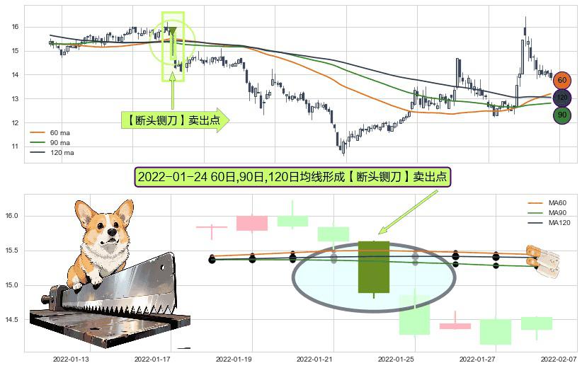 ⚀ 2022-01-24日显现 60日-90日-120日均线 【断头铡刀】卖出点 看空信号,后市看跌,卖出