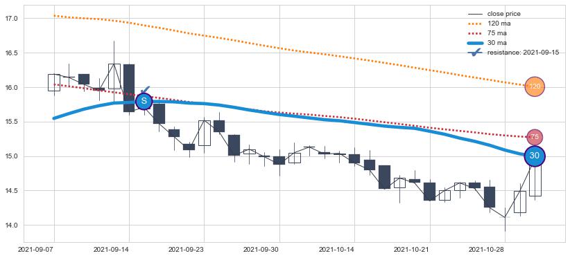 ⚂ 在价格越跌越快过程中,30,60,90均线组合表现出明显的【空头发散】形态,明确的曙光信号
