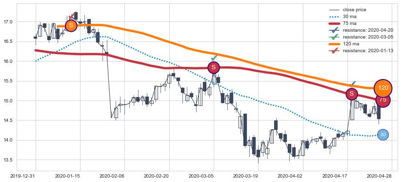 ➢ 最优均线组合共正确确认支撑阻力信号10处,正确确认率 83.33%