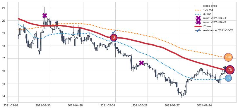 ⚂ 2022-06-28-日均线向上突破,2022-08-08-日重新下穿均线破位,均线阻力再次生效