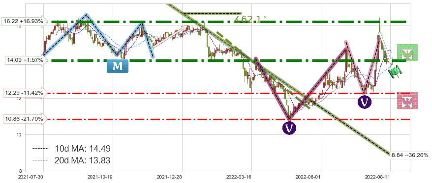 ♘ 阻力价格位14.09,可信任强度90.02%,距离最后交易2022-08-12形成的收盘价格13.87相差 +1.57%