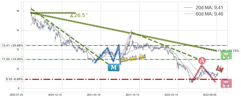 ♘ 支撑价格位8.93,可信任强度72.10%,距离最后交易2022-08-12形成的收盘价格9.57相差 -6.68%
