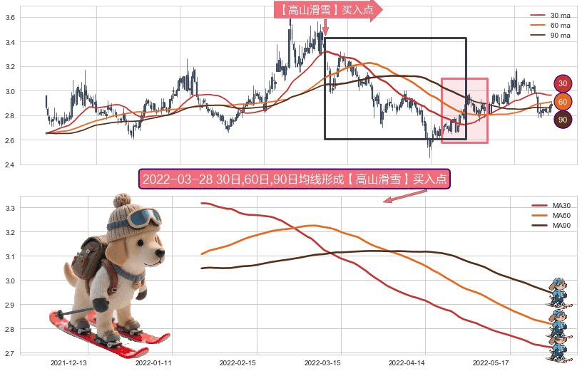 形态多维评估: ⚀ 2022-01-20日-2022-05-31日显现 30日-60日-90日均线 【高山滑雪】买入点 看多信号,后市看涨,买入