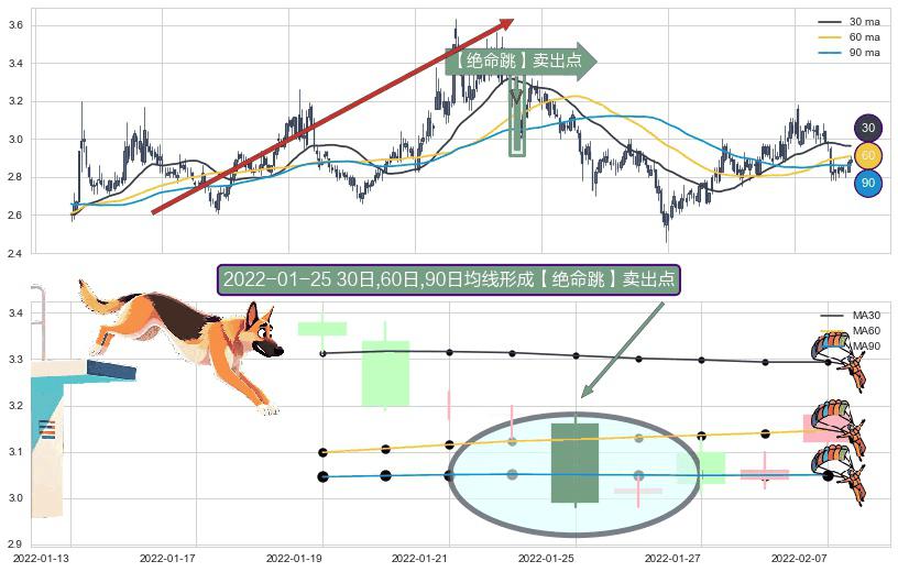 形态多维评估: ⚀ 2022-01-25日显现 30日-60日-90日均线 【绝命跳】卖出点 看空信号,后市看跌,卖出