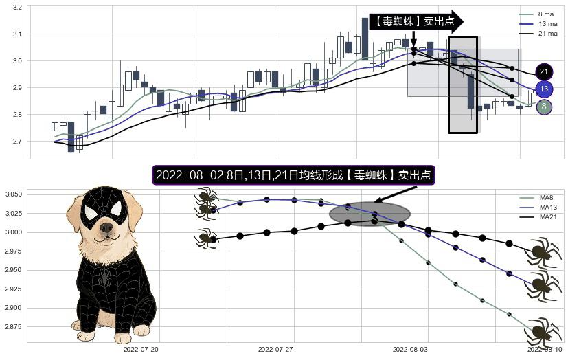 形态多维评估: ⚀ 2022-08-02日显现 8日-13日-21日均线 【毒蜘蛛】卖出点 看空信号,后市看跌,卖出