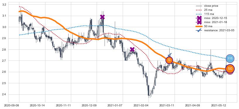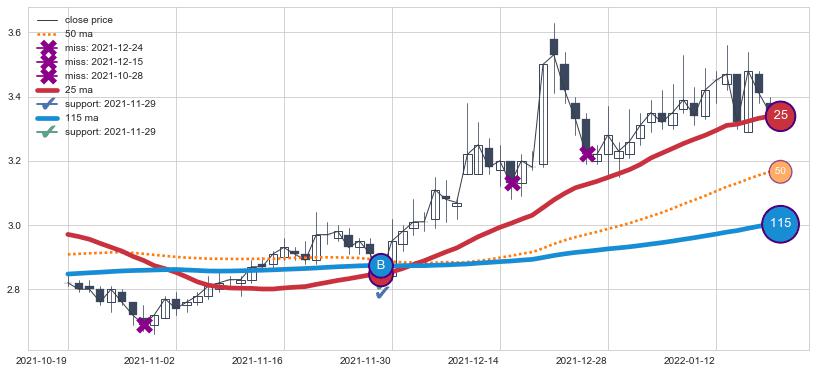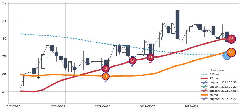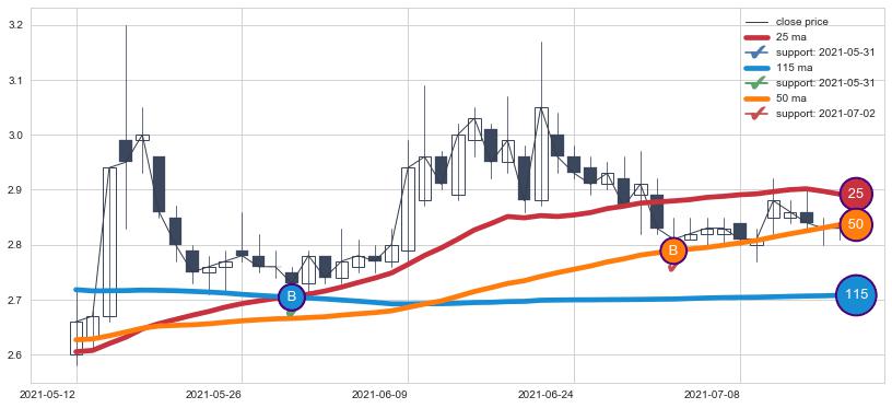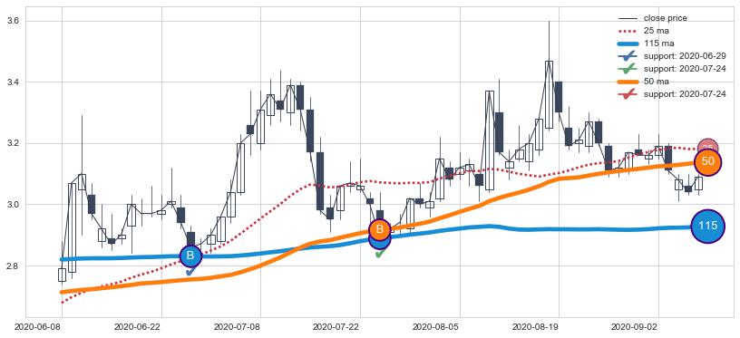 上涨趋势2021-05-12-2021-07-16,均线25, 50, 115确认关键支撑2处