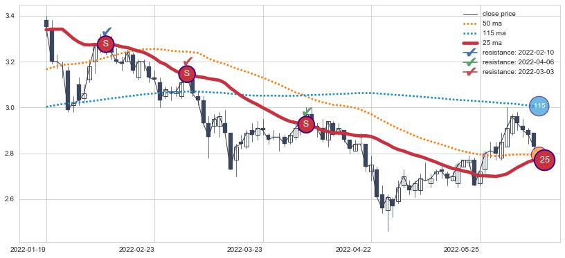 下跌趋势2022-01-19-2022-06-09,均线25确认关键阻力3处