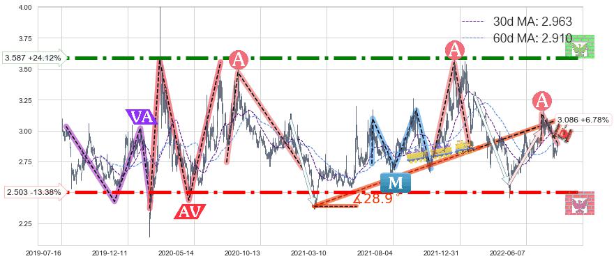 ♘ 阻力价格位3.587,可信任强度93.52%,距离最后交易2022-08-12形成的收盘价格2.890相差 +24.12%