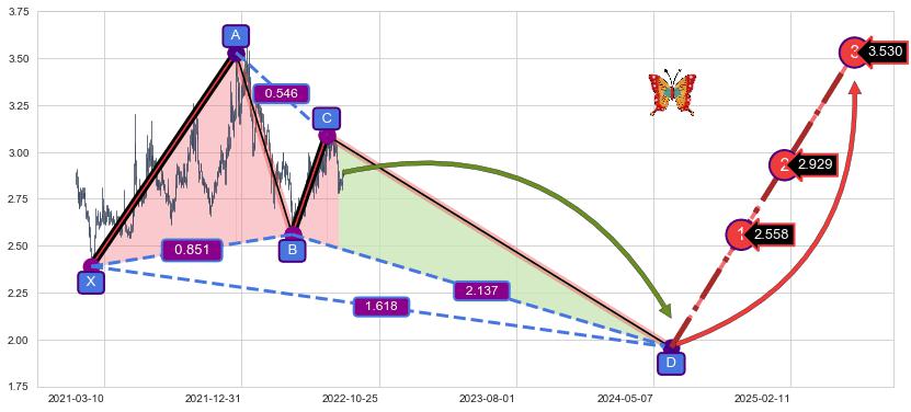 ➣ 未完成【蝴蝶】形态起点X: 2021-02-04, 已到达C点: 2022-07-11, 预测最终D点: 2024-06-12, 共839交易日