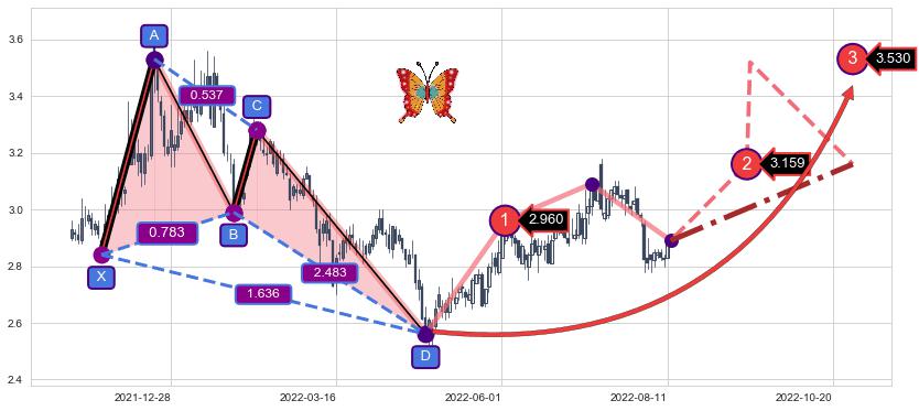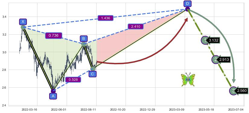 ➣ 未完成【蝴蝶】形态起点X: 2022-02-10, 已到达C点: 2022-08-03, 预测最终D点: 2023-03-16, 共280交易日