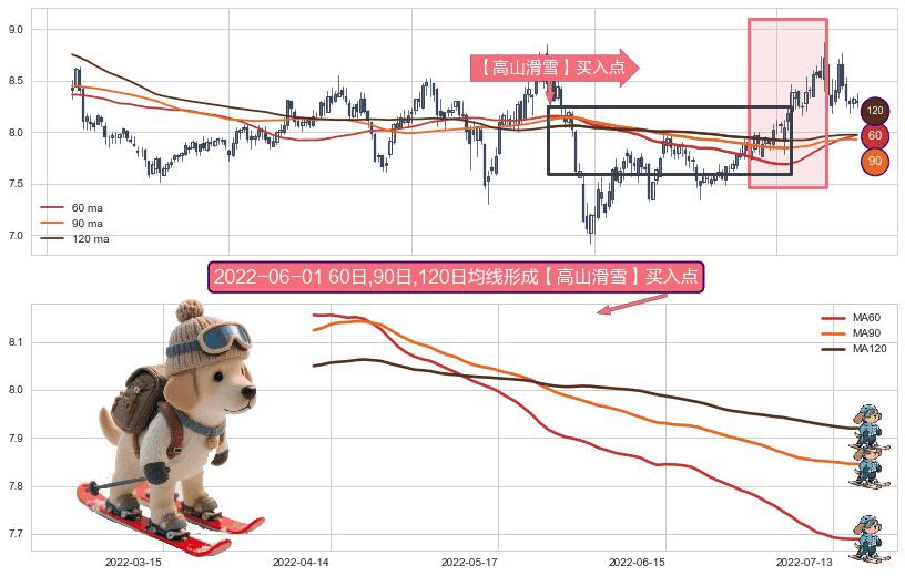 ⚀ 2022-04-12日-2022-07-18日显现 60日-90日-120日均线 【高山滑雪】买入点 看多信号,后市看涨,买入