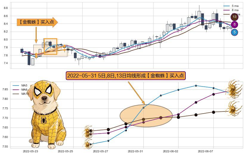 ⚀ 2022-05-31日显现 5日-8日-13日均线 【金蜘蛛】买入点 看多信号,后市看涨,买入