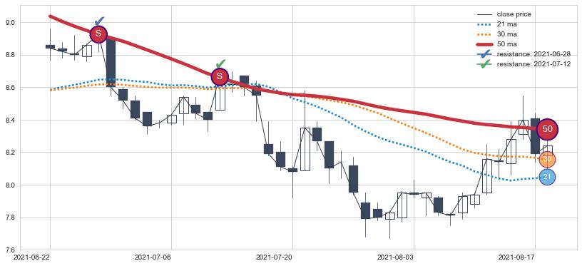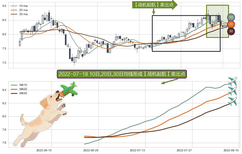 ⚀ 2022-06-24日-2022-08-08日显现 10日-20日-30日均线 【战机起航】卖出点 看空信号,后市看跌,卖出