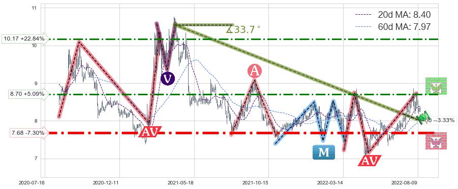♘ 阻力价格位8.70,可信任强度62.79%,距离最后交易2022-08-12形成的收盘价格8.28相差 +5.09%