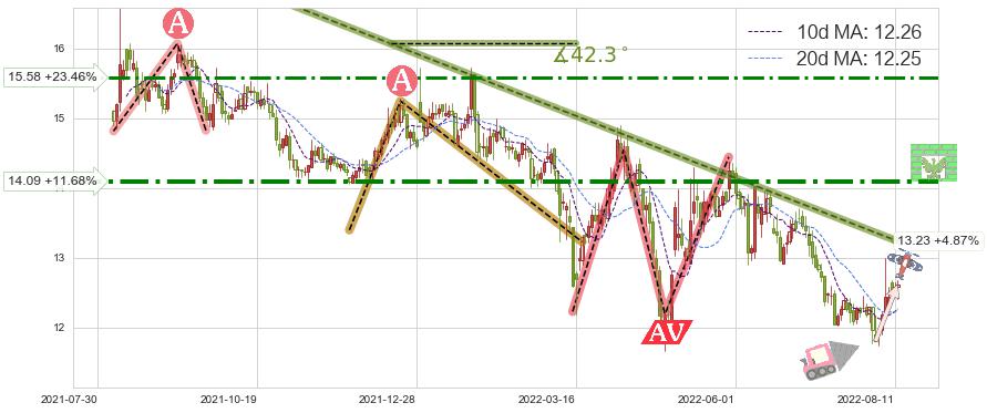 ♘ 阻力价格位14.09,可信任强度70.67%,距离最后交易2022-08-12形成的收盘价格12.62相差 +11.68%