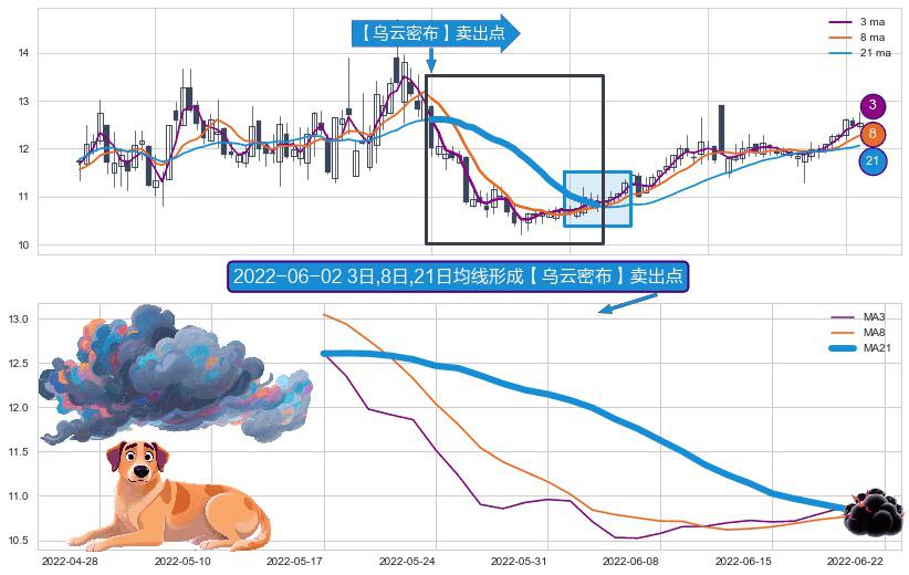 ⚀ 2022-05-17日-2022-06-21日显现 3日-8日-21日均线 【乌云密布】卖出点 看空信号,后市看跌,卖出