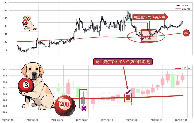 ⚀ 2022-06-16-日显现 葛兰威尔均线 200日均线 第③买入点 上升趋势的中继信号,后市看涨,买进信号