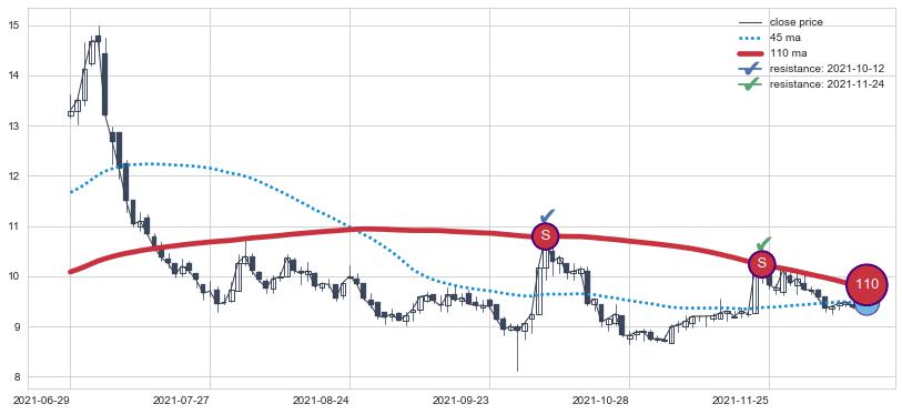 ⚁ MA3和MA8走势平行,且始终保持在短距离内,MA21始终在短中期均线上方,与短中期均线保持一定的距离,微微下行