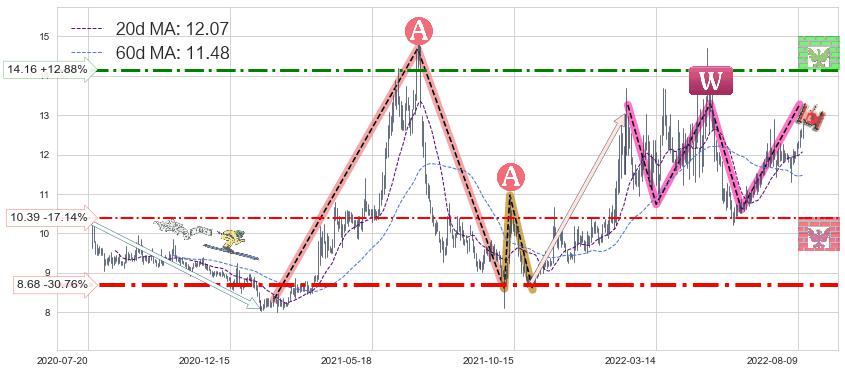 ♘ 阻力价格位14.16,可信任强度62.39%,距离最后交易2022-08-12形成的收盘价格12.54相差 +12.88%