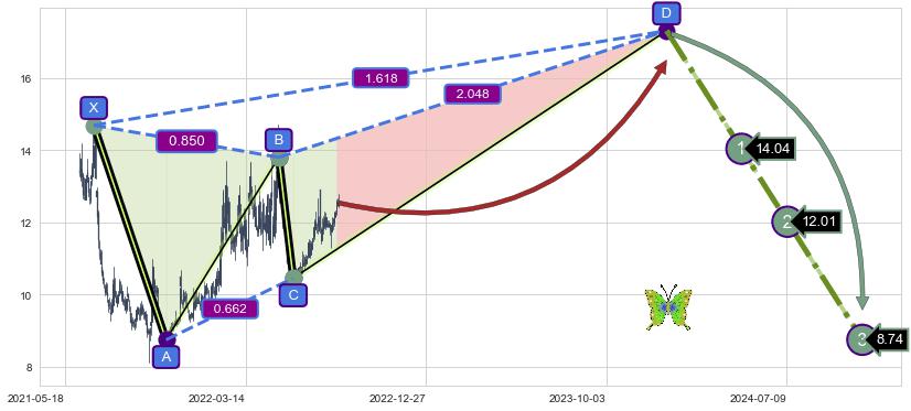 ➣ 未完成【蝴蝶】形态起点X: 2021-07-02, 已到达C点: 2022-06-02, 预测最终D点: 2024-01-04, 共634交易日
