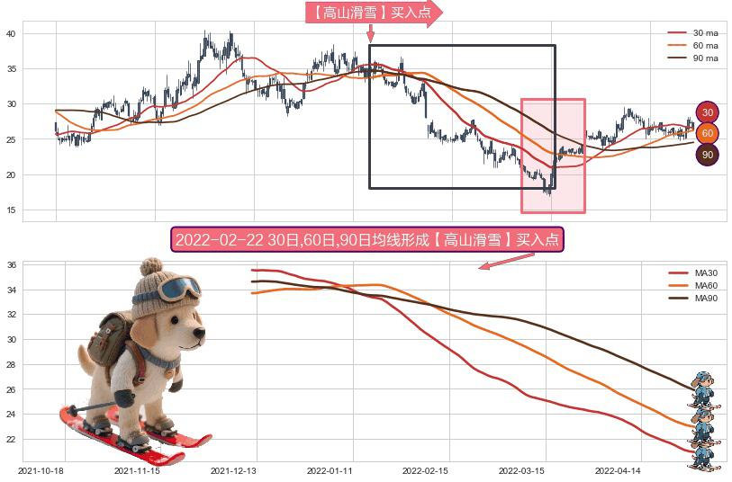 形态多维评估: ⚀ 2021-12-10日-2022-04-29日显现 30日-60日-90日均线 【高山滑雪】买入点 看多信号,后市看涨,买入