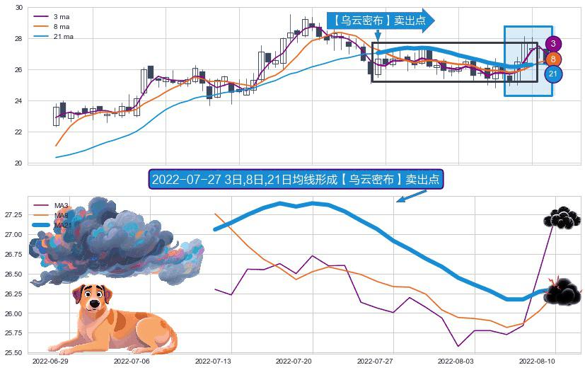形态多维评估: ⚀ 2022-07-12日-2022-08-10日显现 3日-8日-21日均线 【乌云密布】卖出点 看空信号,后市看跌,卖出