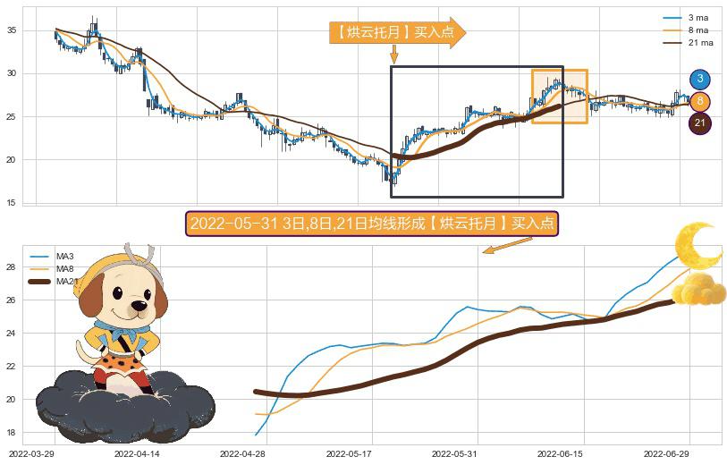 形态多维评估: ⚀ 2022-04-27日-2022-06-29日显现 3日-8日-21日均线 【烘云托月】买入点 看多信号,后市看涨,买入