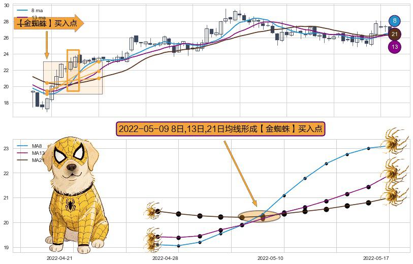 形态多维评估: ⚀ 2022-05-09日显现 8日-13日-21日均线 【金蜘蛛】买入点 看多信号,后市看涨,买入