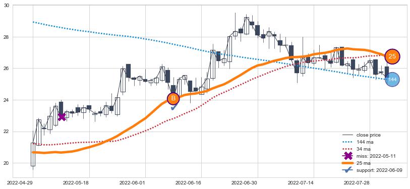 上涨趋势2022-04-29-2022-08-02,均线25确认关键支撑1处