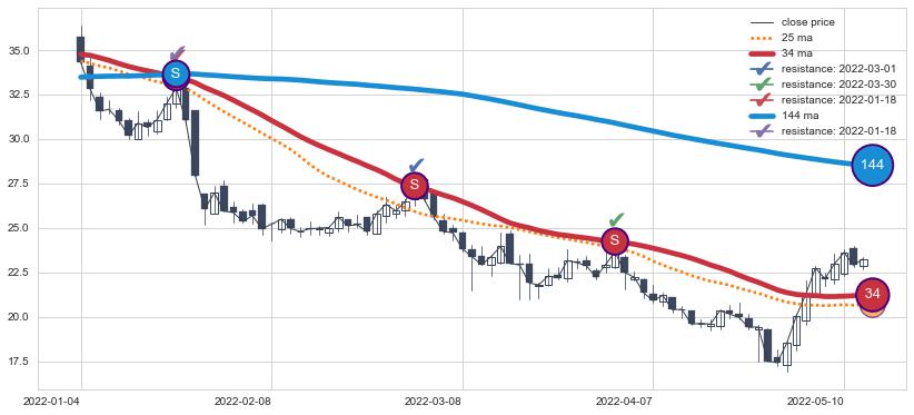 下跌趋势2022-01-04-2022-05-12,均线144, 34确认关键阻力3处