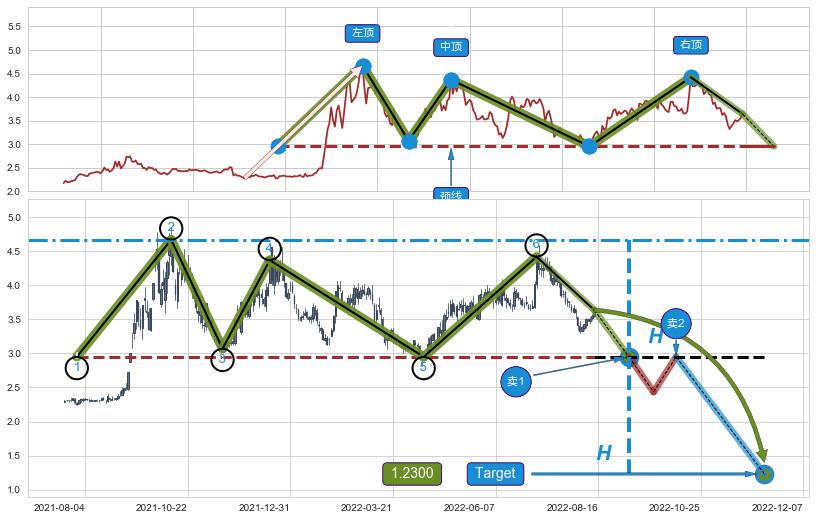 ➢ 最小反转跌幅→𝐇: 1.7200 (三重顶波峰高点到两个波谷连线的垂直距离)