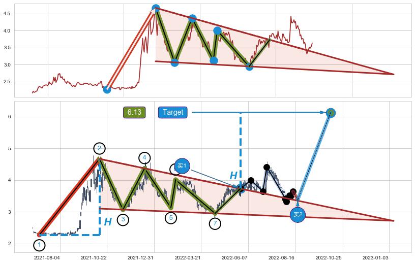 ➢ 【买1】: 激进型 买点 →(2022-05-25: 3.732 )形成突破降🚩楔型【整理】形态