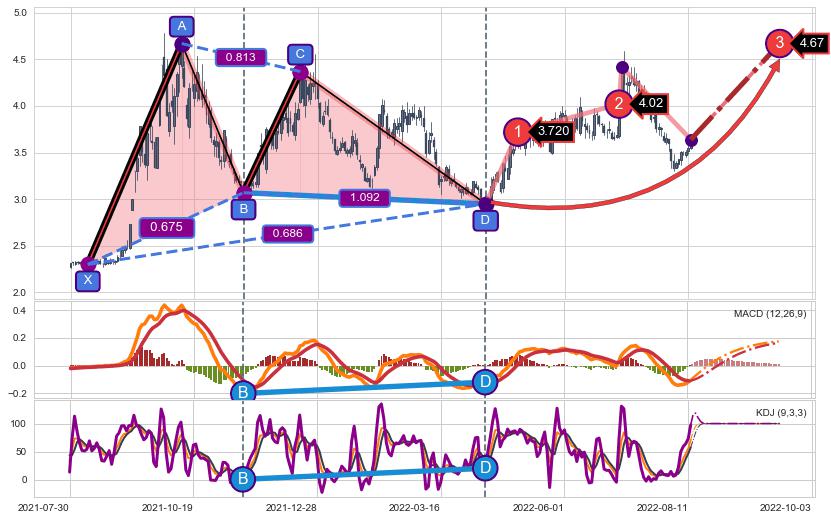 ➣ D点拟合预测价格5.50,距离最后交易收盘价格3.640相差 +51.22%