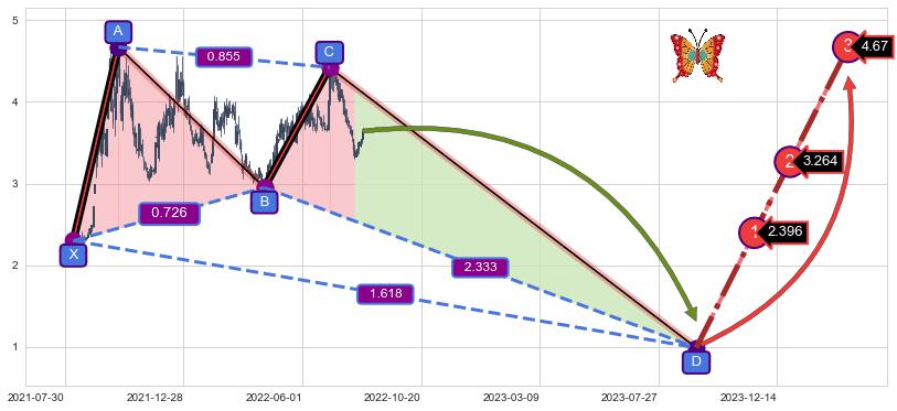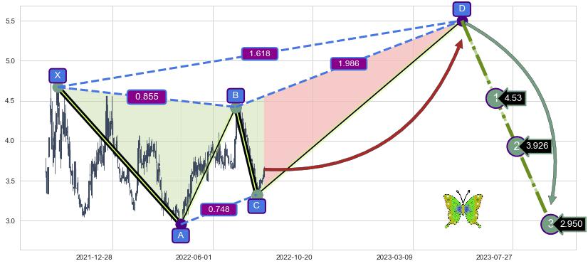 ➣ 未完成【蝴蝶】形态起点X: 2021-10-12, 已到达C点: 2022-08-03, 预测最终D点: 2023-05-17, 共405交易日