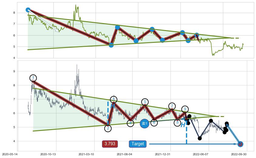 ➣ 【已确认突破】下降【对称】三角形整理 起点:2020-07-13,突破点:2022-03-09,形态共403交易日