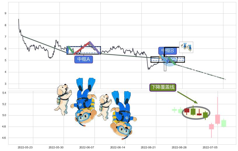 ➣ 【中枢B】:2022-06-13-2022-08-03,中枢由5笔构成,共38交易日, ZG=5.22, ZD=5.15
