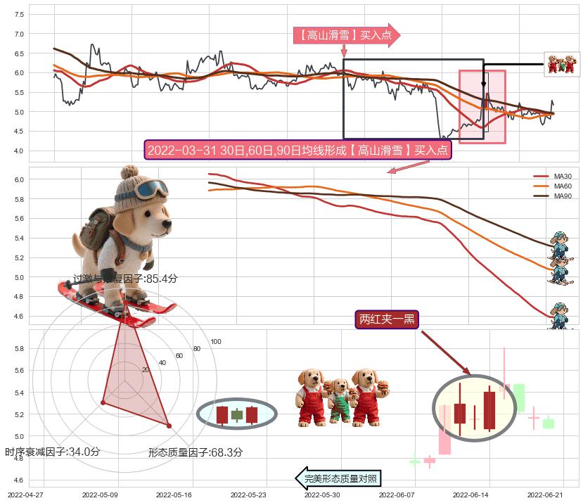 | 3 🅚:上涨螺旋桨形态 ➕ 🎢:【高山滑雪】买入点均线组合买入点信号形成后,猜想后续下行结束,持续反弹上涨(均值回复) ☞ 看多信号 ⇥ 【均线】交织【🅚线】⇥ 综合量化分数: 54 | > |