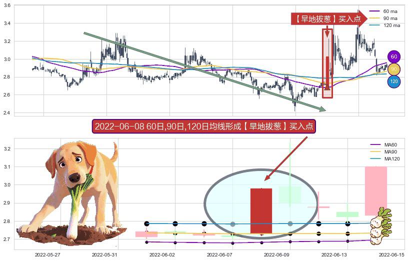 形态多维评估: ⚀ 2022-06-08日显现 60日-90日-120日均线 【旱地拔葱】买入点 看多信号,后市看涨,买入
