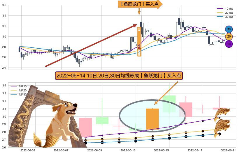 形态多维评估: ⚀ 2022-06-14日显现 10日-20日-30日均线 【鱼跃龙门】买入点 看多信号,后市看涨,买入
