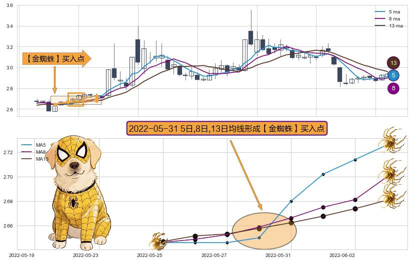 形态多维评估: ⚀ 2022-05-31日显现 5日-8日-13日均线 【金蜘蛛】买入点 看多信号,后市看涨,买入