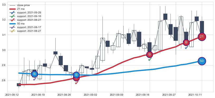 上涨趋势2021-08-12-2021-10-11,均线50, 21确认关键支撑4处