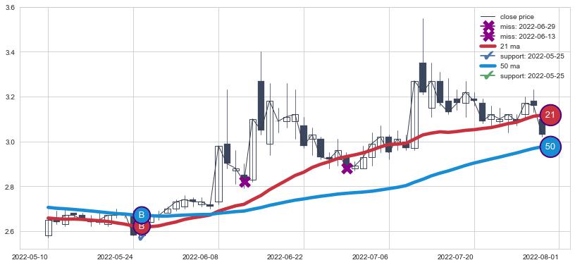 上涨趋势2022-05-10-2022-08-01,均线50, 21确认关键支撑1处