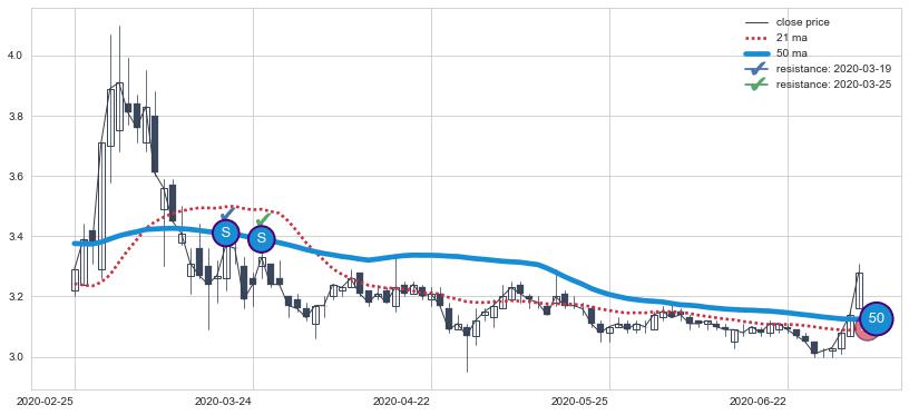 下跌趋势2020-02-25-2020-07-06,均线50确认关键阻力2处
