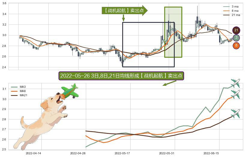 形态多维评估: ⚀ 2022-04-28日-2022-06-20日显现 3日-8日-21日均线 【战机起航】卖出点 看空信号,后市看跌,卖出
