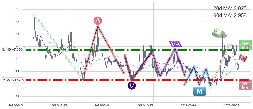 ♘ 阻力价格位3.148,可信任强度90.19%,距离最后交易2022-08-12形成的收盘价格2.940相差 +7.08%