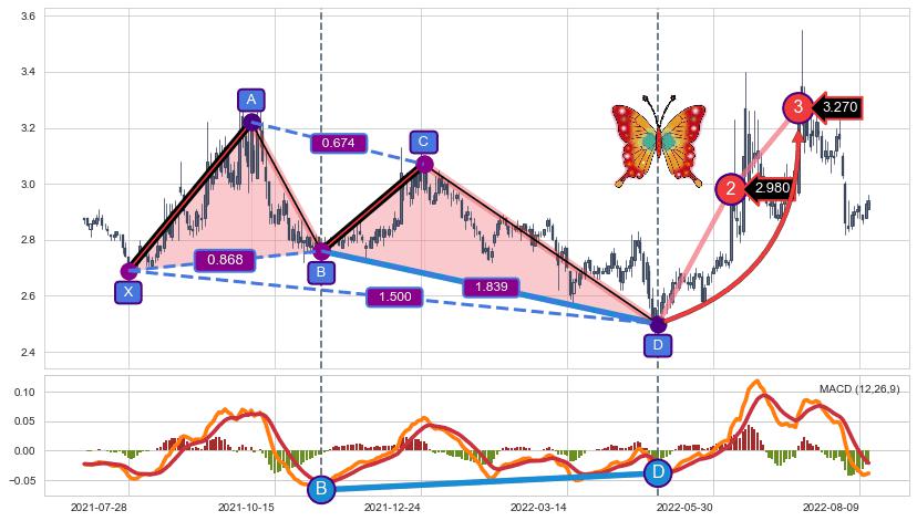 ➣ 已完成【蝴蝶】形态起点X: 2021-07-28, 终点D: 2022-04-28, 共182交易日