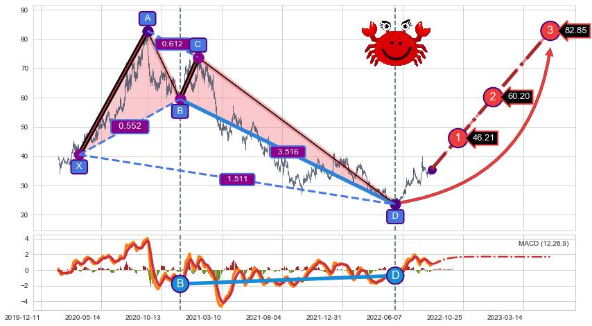 | 14 🅚:【蛟龙出海】买入点 ➕ 📡:谐波螃蟹已到达d点:猜想c下行到达d点后报复性拉升上涨(均值回复) ☞ 看多信号 ⇥ 【均线】交织【图形】⇥ 综合量化分数: 52 | > |