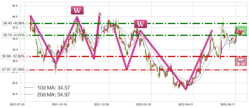 ♘ 阻力价格位35.75,可信任强度83.42%,距离最后交易2022-08-12形成的收盘价格35.58相差 +0.47%