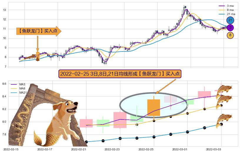 ⚀ 2022-02-25日显现 3日-8日-21日均线 【鱼跃龙门】买入点 看多信号,后市看涨,买入