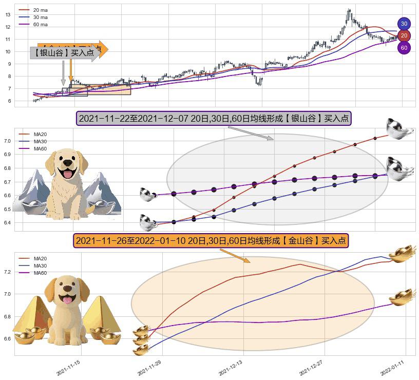 ⚀ 2021-11-29-日至2022-01-10-日显现 20日-30日-60日均线 【金山谷】买入点 其再次确认了买入信号,可靠性更强,买入